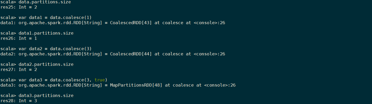 coalesce:对RDD重新分区。第一个参数是重分区的数目,第二个参数为是否进行shuffle,默认为false。如果重分区的数目大于原分区,则需要设为True。