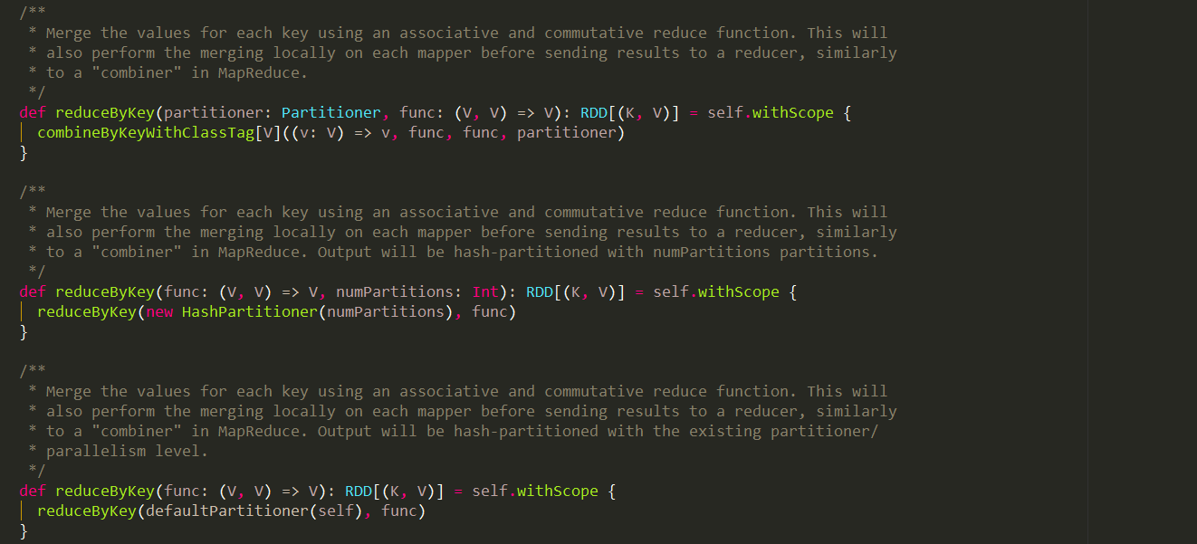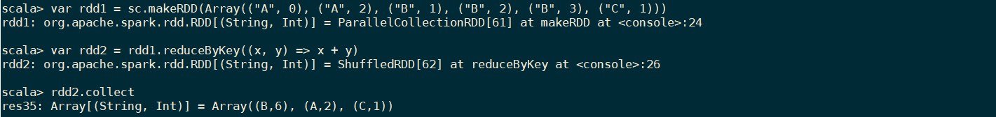 reduceByKey:将RDD[K, V]中每个K对应的V根据映射函数进行计算。
