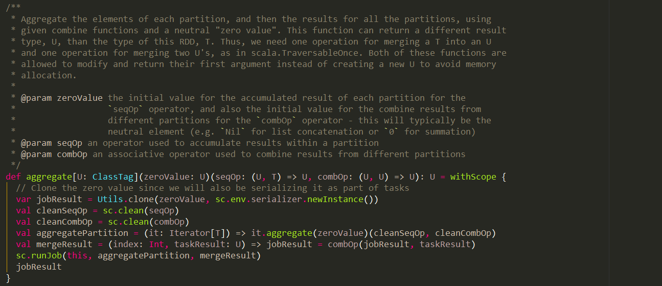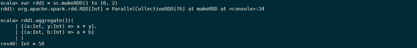 先在每个分区中迭代执行(x:Int, y:Int) => x + y,并且zeroValue为1,即分区1中为1+5+4+3+2+1=16,分区2中为1+10+9+8+7+6=41